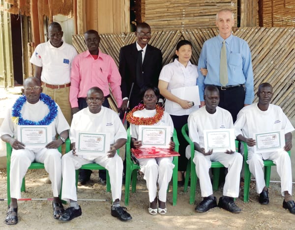 Cinco adultos impedidos de la vista (sentados) muestran certificados como masajistas, que recibieron en un programa de entrenamiento laboral iniciado por el Padre Barth.