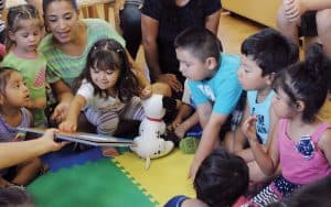welcoming-new-neighbors María López (polo verde con rayas grises) participa en un programa del centro familiar que ofrece Neighbors Link, donde los padres aprenden cómo ayudar a sus hijos para que tengan éxito en la escuela.