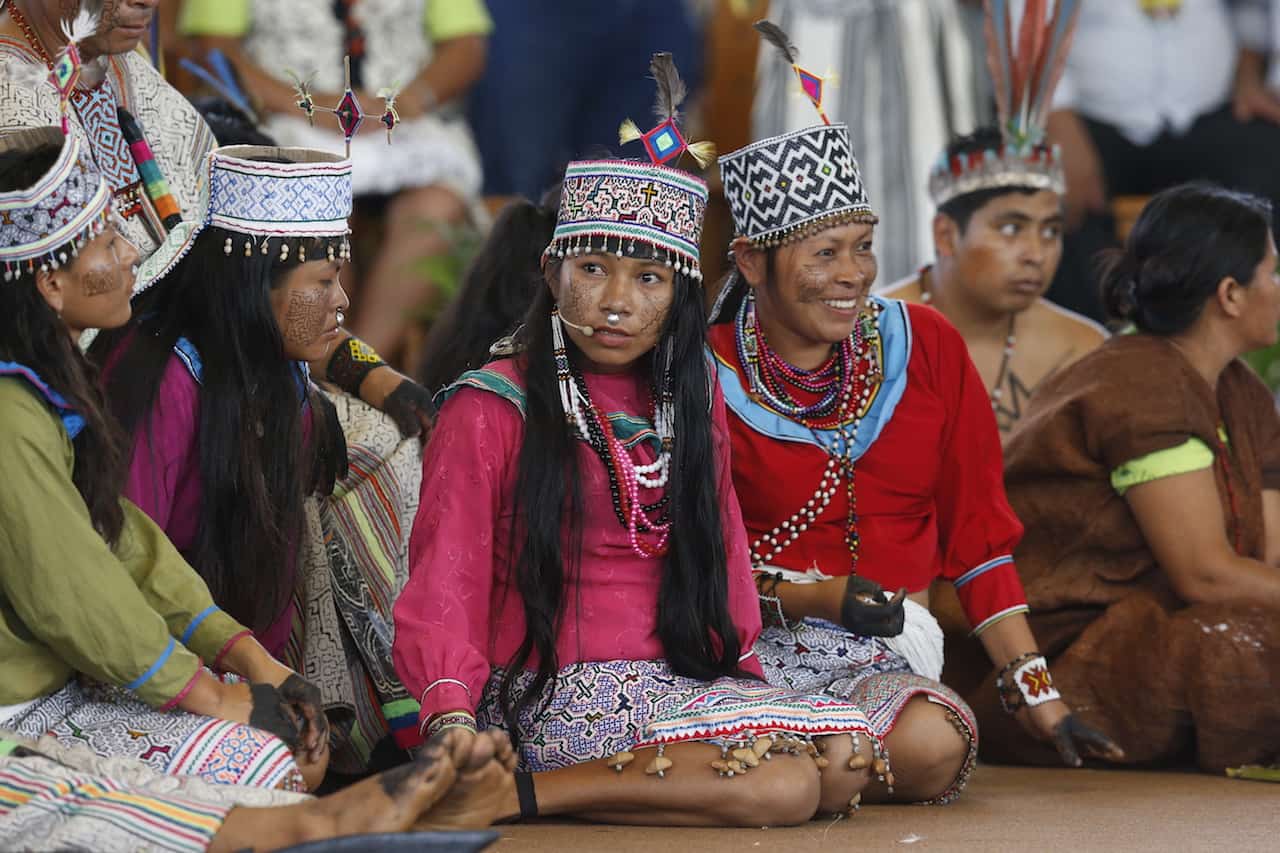 POPE PERU VISIT Young members of an indigenous group from the Amazon region listen during a meeting with Pope Francis during a Jan. 19 meeting at Madre de Dios stadium in Puerto Maldonado, Peru.