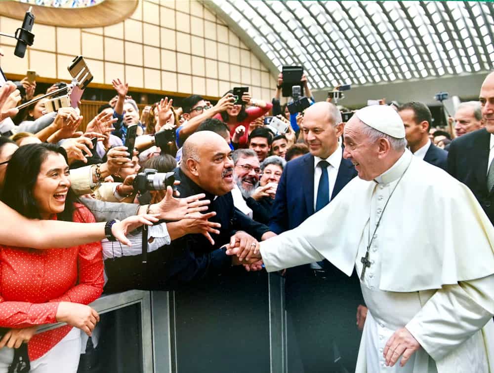 relatos-misioneros-enero-febrero-2019-roma El Padre Maryknoll Roberto Rodriguez saluda al Papa Francisco en Roma, después de avisarle que el Padre jesuita Jon Sobrino estaba presente. (L’Osservatore Romano/Vaticano)
