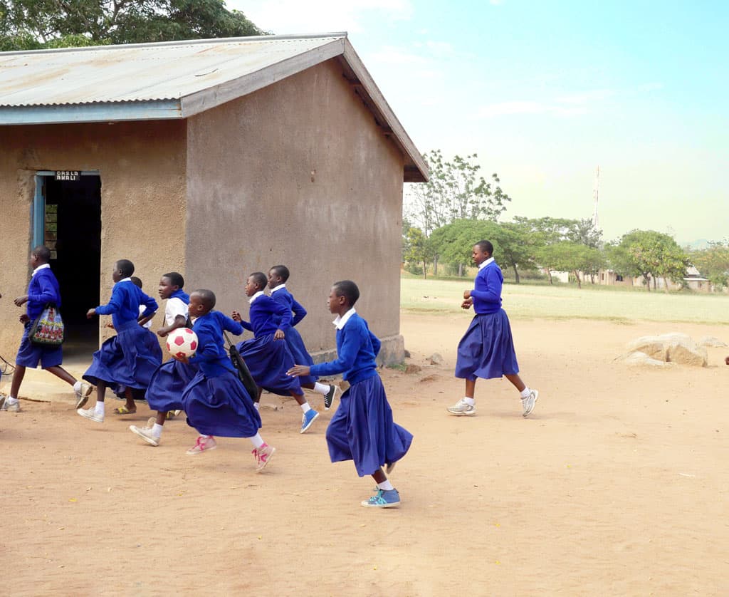 merecen-una-oportunidad-escolar-01 Niñas de la Escuela Primaria Mmazami, en Tanzania, corren después de clases. Muchos estudiantes están en la escuela debido al apoyo de la Hermana Maryknoll Marion Hughes. (Sean Sprague/Tanzania)