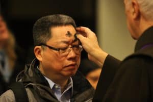 Un hombre recibe cenizas el miércoles de ceniza en la iglesia de San Francisco de Asís en Nueva York en 2014. En su mensaje para la Cuaresma, el Papa Francisco dijo que la temporada es «un tiempo para renovar la fe, la esperanza y el amor». (CNS/ Gregory A. Shemitz)
