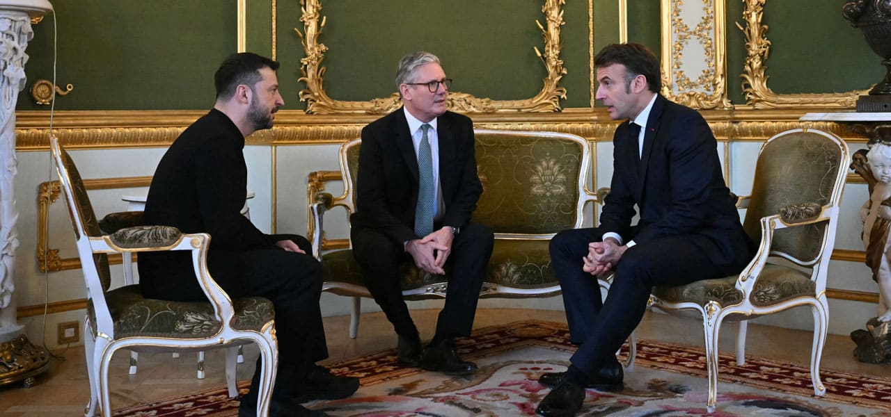 Imagen destacada: El presidente ucraniano Volodímir Zelenski, el primer ministro británico Keir Starmer y el presidente francés Emmanuel Macron se reúnen durante una cumbre de líderes europeos en Lancaster House en el centro de Londres el 2 de marzo del 2025. (OSV News photo/Justin Tallis, Reuters)