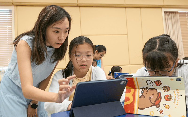 5—hongkong-2024-jeffrey-maryknoll-school-314-(1) Una docente de la clase de música digital ayuda a estudiantes a crear loops en el género musical de su preferencia usando Garageband en iPads. (Paul Jeffrey/Hong Kong)