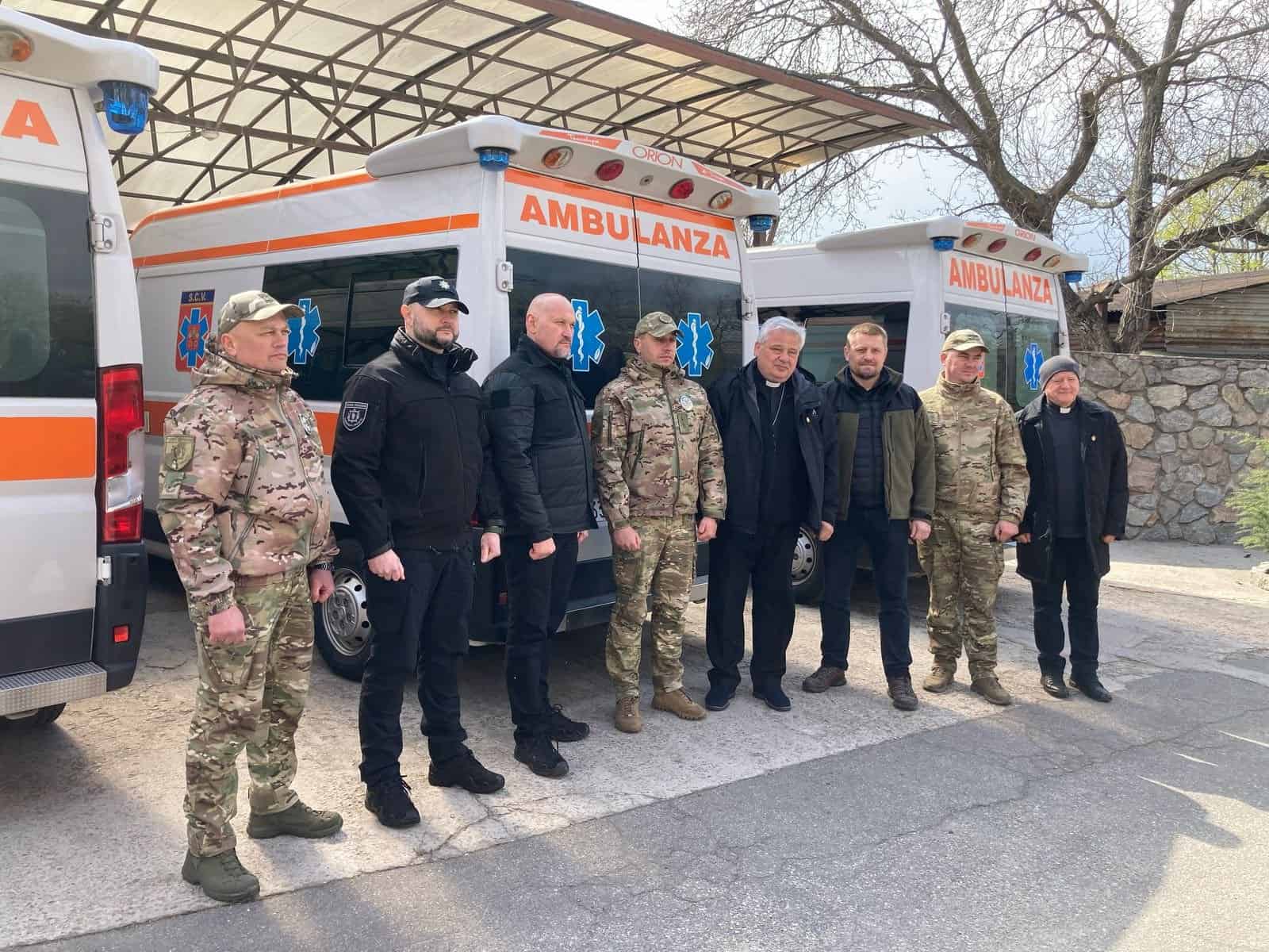 Imagen destacada: Militares y autoridades ucranianas aparecen en una fotografía del 8 de abril de 2025 en Zaporizhzhia, en el este de Ucrania, mientras el limosnero papal, el cardenal Konrad Krajewski (centro), y el obispo auxiliar de Kharhiv-Zaporizhzhia, Jan Sobilo (derecha), les entregan el regalo del Papa Francisco: modernas ambulancias. El prefecto del Dicasterio para el Servicio de la Caridad y otros tres conductores, también sacerdotes, condujeron cuatro ambulancias a Ucrania para la 10ª misión al país devastado por la guerra del cardenal Krajewski como enviado papal. Las ambulancias iban llenas de medicamentos por valor de 220.000 dólares. Tres ambulancias fueron donadas a Zaporizhzhia y una a Kharkiv. (OSV News photo/cortesía del obispo Jan Sobilo)