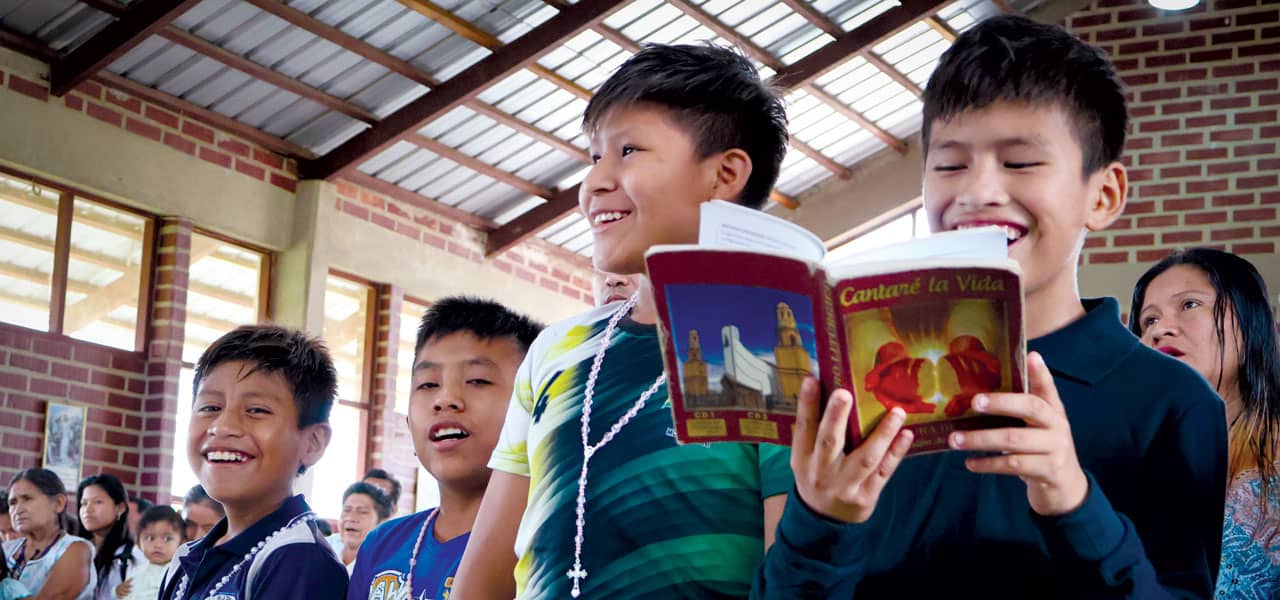 SU25-latinoamerica-feature Niños de la comunidad indígena del TIPNIS en la Amazonía boliviana, cantan jovialmente en una Misa celebrada en la parroquia Santísima Trinidad, donde los misioneros Maryknoll sirven. (Adam Mitchell/Bolivia)