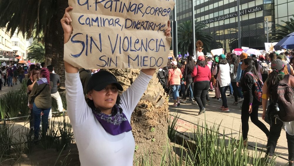 Joanely Martínez muestra una pancarta durante la marcha de las mujeres el 8 de marzo de 2020 en Ciudad de México. También participó en una huelga nacional de mujeres al día siguiente. Afirmó que el Gobierno “no hace nada” para proteger a las mujeres, que exigen a las autoridades que tomen más medidas para poner fin al asesinato de mujeres y niñas. (CNS/David Agren)