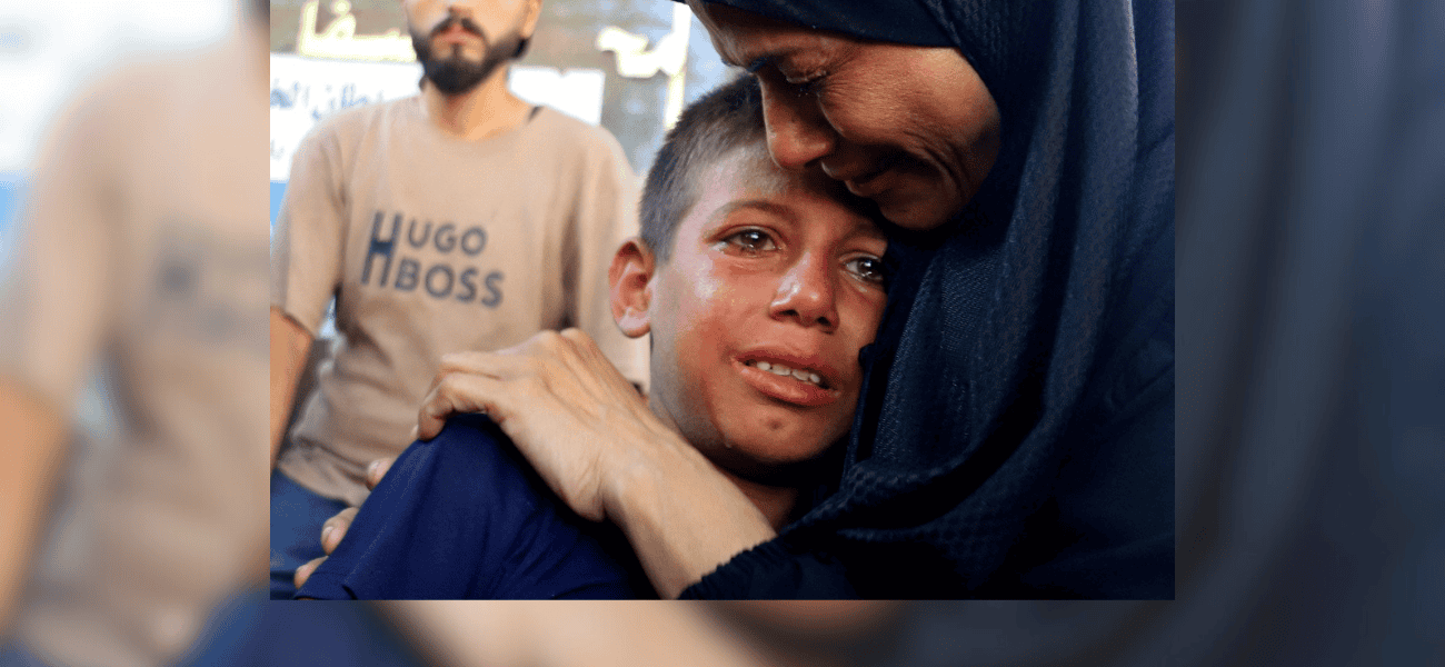 Un niño llora durante el funeral celebrado el 14 de agosto de 2025 por los palestinos muertos en un ataque aéreo israelí mientras buscaban ayuda en la ciudad de Gaza, en la Franja de Gaza, según informan los médicos. (OSV News/Ebrahim Hajjaj, Reuters)