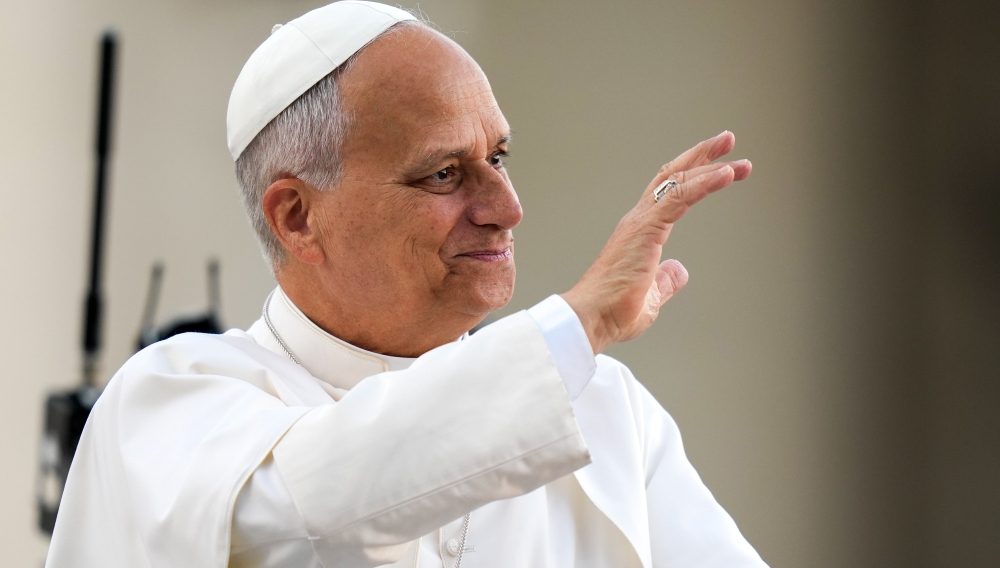 El Papa León XIV saluda a la gente desde el papamóvil mientras recorre la plaza de San Pedro en el Vaticano antes de dirigir una vigilia de oración y el rezo del rosario por la paz el 11 de octubre de 2025. (CNS/Lola Gómez)